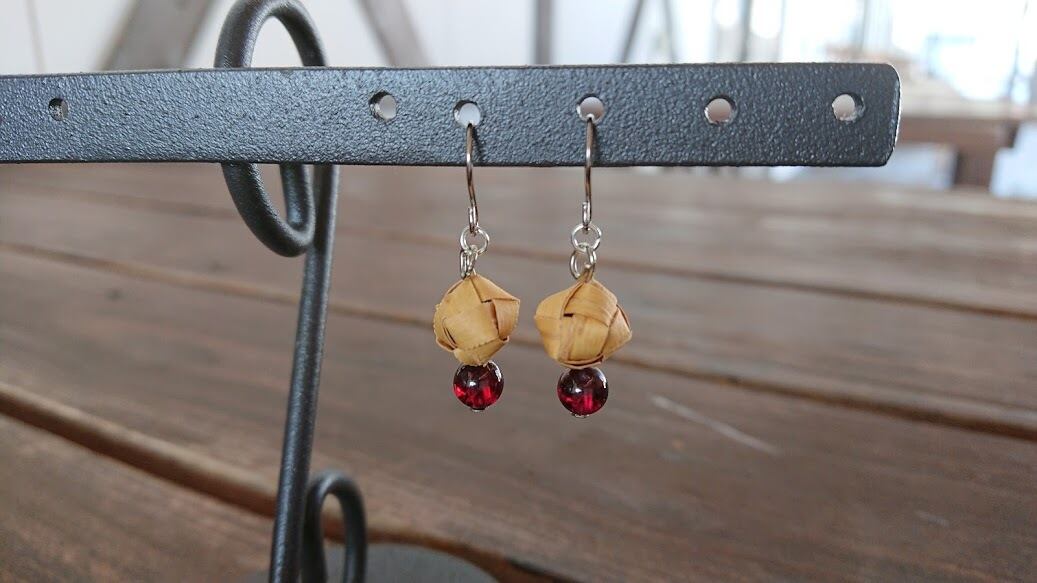 北海道の白樺樹皮で作ったキューブと天然石のゆらゆら揺れる小さなピアスです。